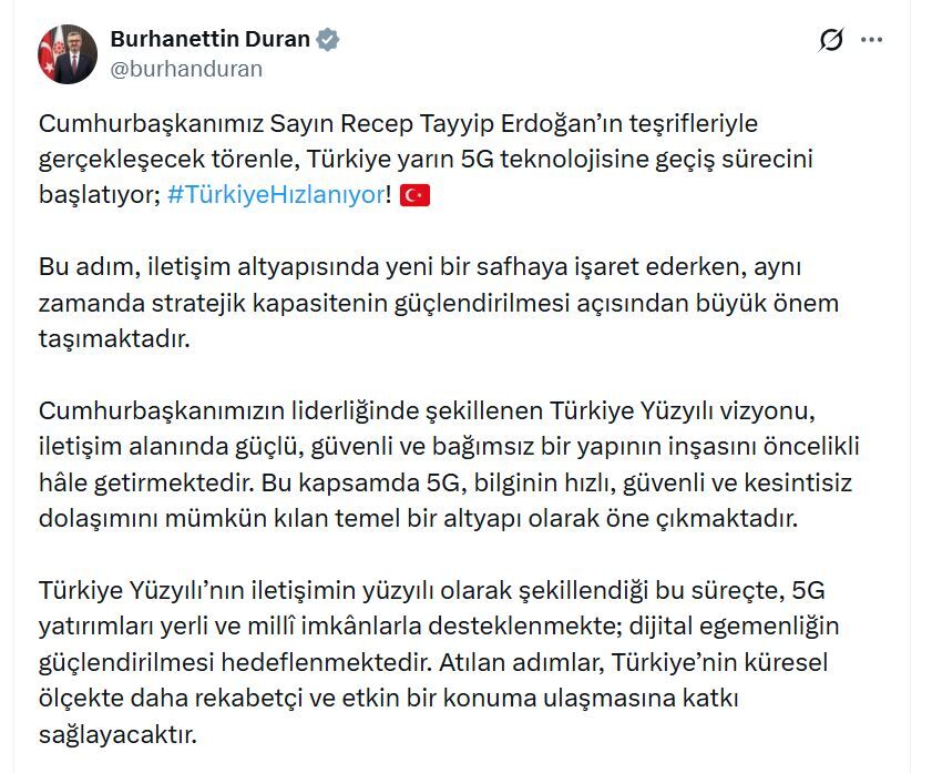 İletişim Başkanı Duran, sanal medya hesabından yaptığı açıklamada, “Cumhurbaşkanımız Sayın Recep Tayyip Erdoğan’ın teşrifleriyle gerçekleşecek törenle, Türkiye yarın 5G teknolojisine geçiş sürecini başlatıyor; Türkiye hızlanıyor. Bu adım, iletişim altyapısında yeni bir safhaya işaret ederken, aynı zamanda stratejik kapasitenin güçlendirilmesi açısından büyük önem taşımaktadır. Cumhurbaşkanımızın liderliğinde şekillenen Türkiye Yüzyılı vizyonu, iletişim alanında güçlü, güvenli ve bağımsız bir yapının inşasını öncelikli hale getirmektedir. Bu kapsamda 5G, bilginin hızlı, güvenli ve kesintisiz dolaşımını mümkün kılan temel bir altyapı olarak öne çıkmaktadır” dedi.